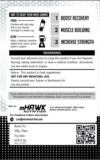 Accelerated Muscle Growth Enriched with premium whey protein to boost muscle synthesis and development. Enhanced Strength and Power Includes creatine monohydrate to improve strength, endurance, and workout performance. Sustained Energy Release Contains complex carbohydrates for long-lasting energy during intense training sessions. Improved Recovery Infused with essential amino acids and glutamine to reduce muscle soreness and support faster recovery.